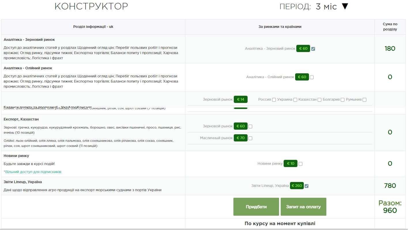 Вибираючи потрібний розділ, Ви відразу ж бачите його вартість та загальну підсумкову суму передплати. Вартість пакету розраховується з вартості доступу до окремих обраних Вами розділів. Також є можливість розбити деякі розділи окремо за ринками (олійний/зерновий) та країнами.